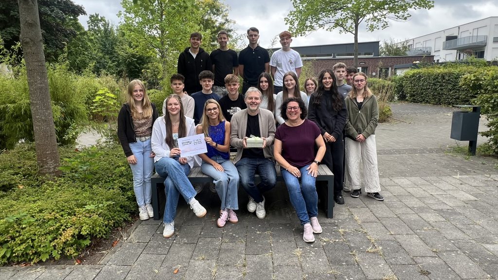 Am Ende eines erfolgreichen Schuljahres konnte die Schülerfirma des 10. Jahrgangs im Fach Wirtschaft (er-)leben ihr unternehmerisches Handeln feiern: Die Schülerinnen und Schüler überreichten Frau Hebisch und Herrn Steinzen von der Gambia AG einen Scheck in Höhe von 780 Euro.